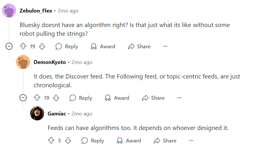 • No algorithm manipulation: Bluesky offers default feeds to its users that provide post suggestions based on following and engagement. But users can also create custom feeds or join pre-made online communities for alternative algorithms.