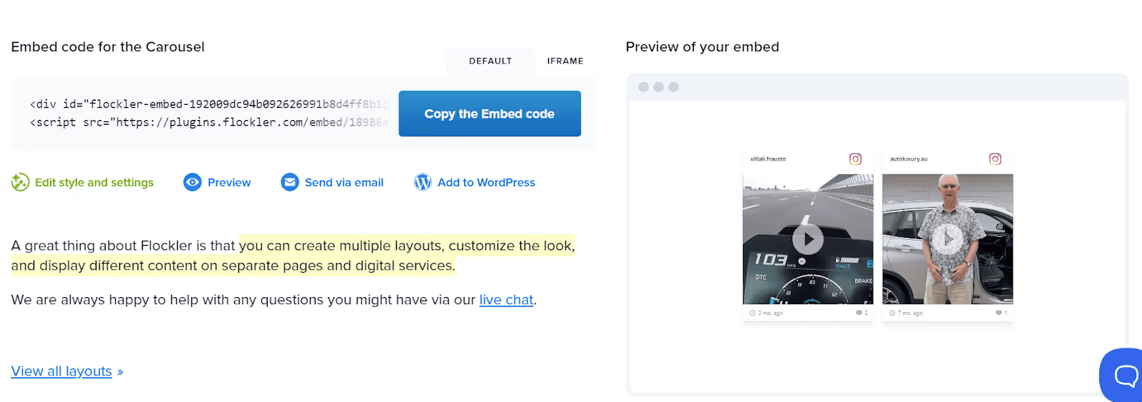The manual method works fine for one or two videos. But if your business regularly posts videos or you want to embed many videos in dynamic layouts, a social tool like Flockler is far more efficient.