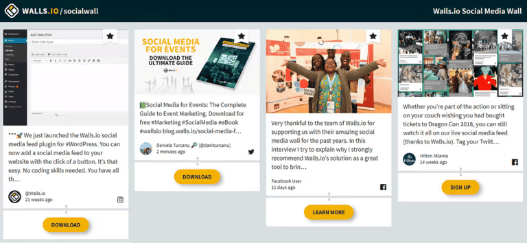 Next in our list is Walls.io, a simple but sturdy social media post aggregator. The tool collects content from the leading social platforms similar to Flockler. A unique feature of Walls.io is the interactive wall feature, which lets audiences contribute as well.